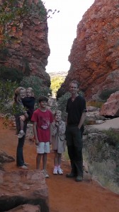 Our alternative plan was to do the Mala walk (which I had planned to do with the girls anyway). This was a short walk to a gorge area at the base of the rock. We found out that there is a free ranger-guided tour on the Mala walk at 10am each day. It was 9.15 at the time. So we decided we would go back to the cultural centre for a little while, until the tour start time. We did this – it was a fairly quick look. Then we were back at the start of the Mala walk. We met our ranger guide -Tim. He indicated it would be a 2 hr tour with lots of information about the cultural aspects of Uluru, as well as the geological aspects. We decided we would start with the group, and see how the kids were holding out as to how long we stayed with it. It turned out we stayed for the whole 2 hrs and learnt quite a lot of interesting information. Lauren and Sam listened in to all of it, and Hannah and Beth listened to some and played in the dirt quietly for a lot of it – this was OK. We learnt about how the more lush vegetation was close in to the base of the rock because when it rained the rock had sections of it which became like waterfalls and directed water to certain areas around the base. The aboriginals would come into the area and gather food etc for a period and then move on. They didn’t tend to live permanently at the rock. We learnt some more about the bush tucker and how they made their weapons and eating implements from the bark of trees. We saw some aboriginal art sites and our guide described some of the background to aboriginal art and how it usually tells a story. He did this by drawing with a stick in the dirt and it was very interesting the way he described the whole thing. He had all the kids captivated. For the next few days Hannah and Bethany were always drawing pictures and stories in the dirt. Next we learnt about some of the geology of the rock – that it is actually feldspar – a metaphorphosised type of sandstone. Pure feldspar is actually a greyish colour, but the rock looks red because the red dust from the surrounding plains blows onto it and it now has a thick layer of this red (rust) dirt on it. Rather than being smooth, the surface of the rock is actually like shingles on a roof, facing upwards. This is due to the effect of the water running down the rock and causing ‘blisters’ that lift off, just like the blistering that occurs on a rusting car. Our guide described it like a cheese grater. And he said it does damage like a cheese grater when people fall doing the climb and slide down. We learnt a little bit about some of the mammals in the area too. We finished the tour at the waterhole of Mala gorge. We then all walked back to the car.